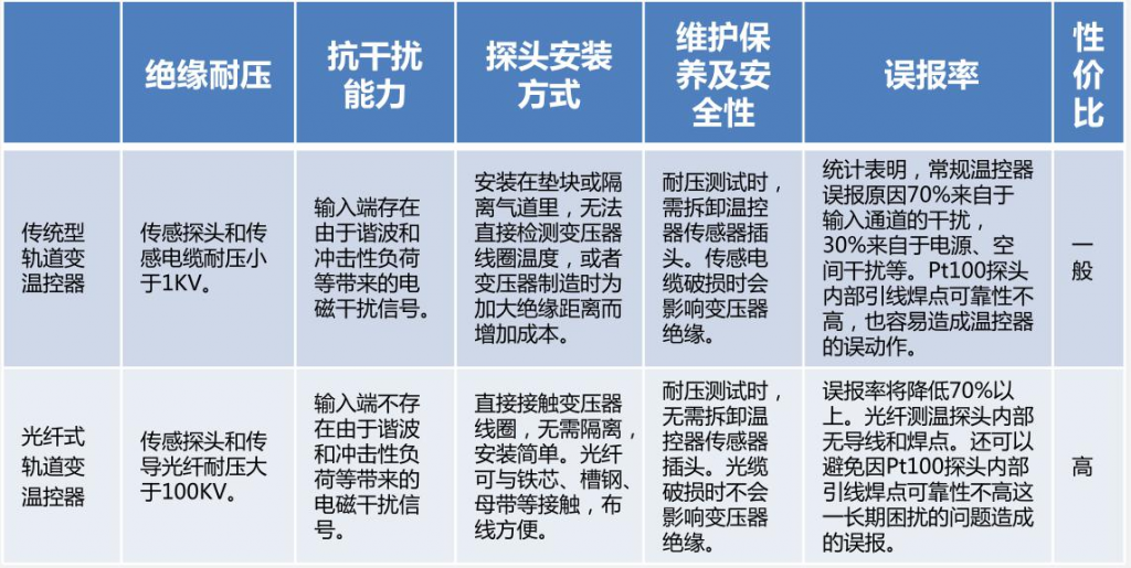 以傳統(tǒng)型軌道交通溫控器與光纖式軌道交通溫控 器的應(yīng)用做對(duì)比,如下表:
