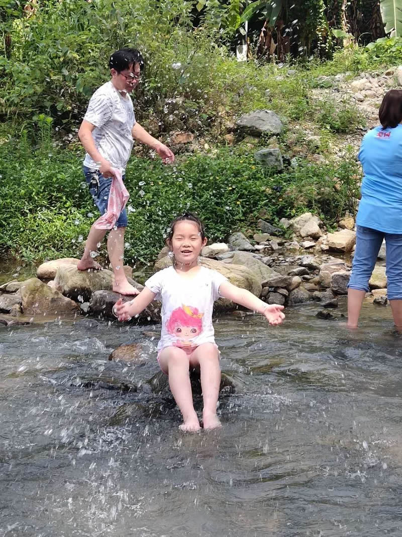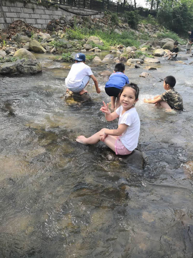 小孩們?cè)诖笕藗兊膸ьI(lǐng)下,在潺潺的溪水中歡樂的玩耍,夏季炎熱的天氣,唯有戶外的清涼能夠帶來一絲絲的暢快。